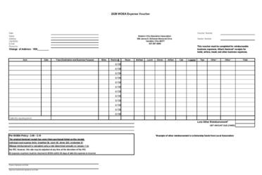 All expenses, with the exception of mileage, must be accompanied by an original receipt. Expense vouchers must be submitted no later than 60 days after the event. Line items (committees, etc.) are found on page two.